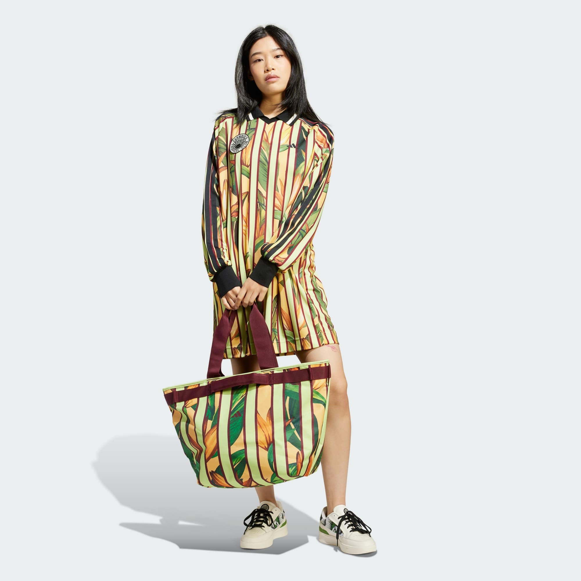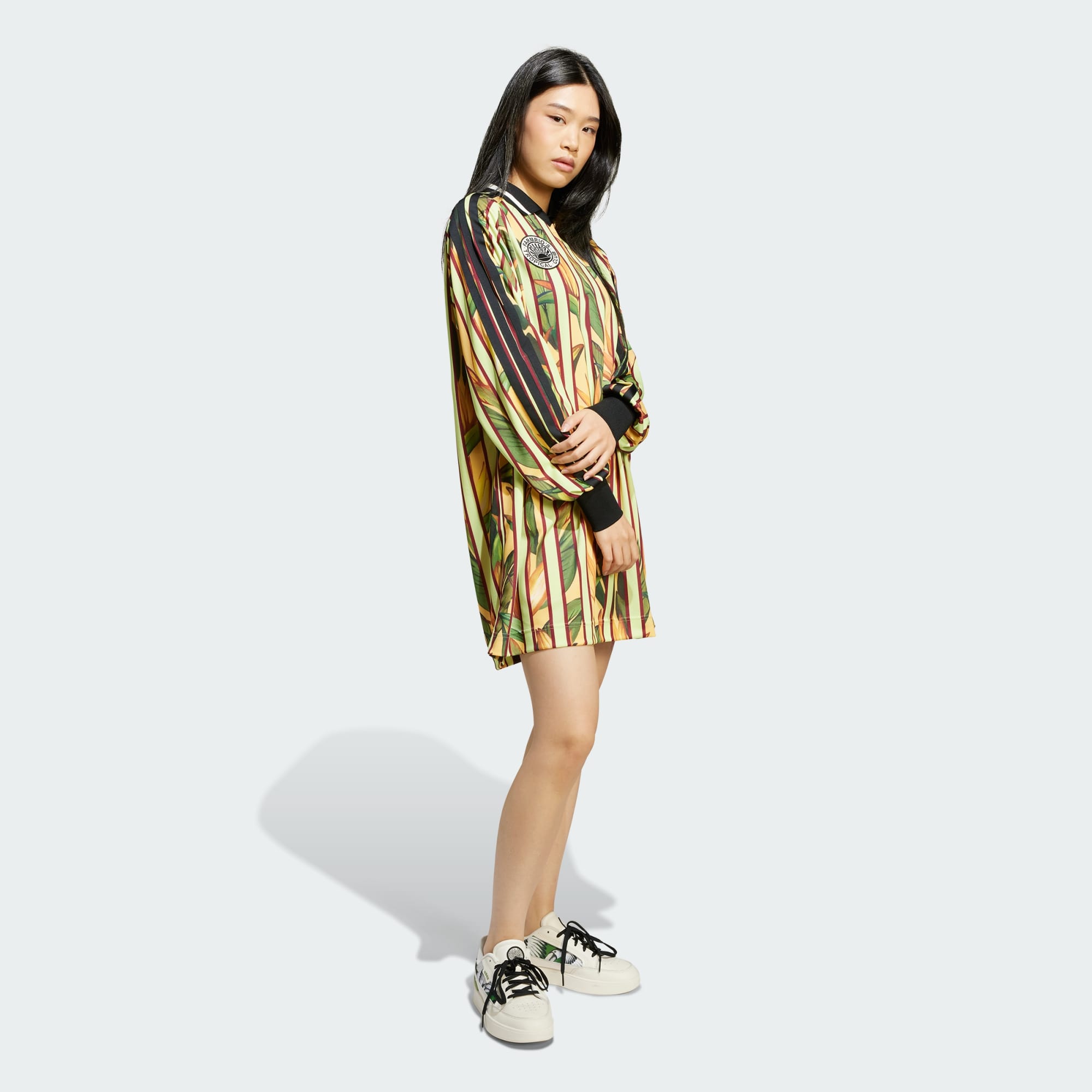 Visa upp sportig stil i den här förstklassiga klänningen från adidas. Den är designad i samarbete med FARM Rio och har ett tropiskt tryck för en iögonfallande look. Det smidiga dubbelstickade materialet och den lösa siluetten ger rörelsefrihet. Bär den med sneakers för en sportig look eller klä upp den med klackar för en utekväll. Hur du än stylar den kommer du att ger den en energi till din outfit. Den här produkten är gjord med 100 % återvunnet material. Genom att återanvända material som redan skapats bidrar vi till att minska avfall, minska vårt beroende av ändliga resurser och minska våra produkters miljöavtryck.