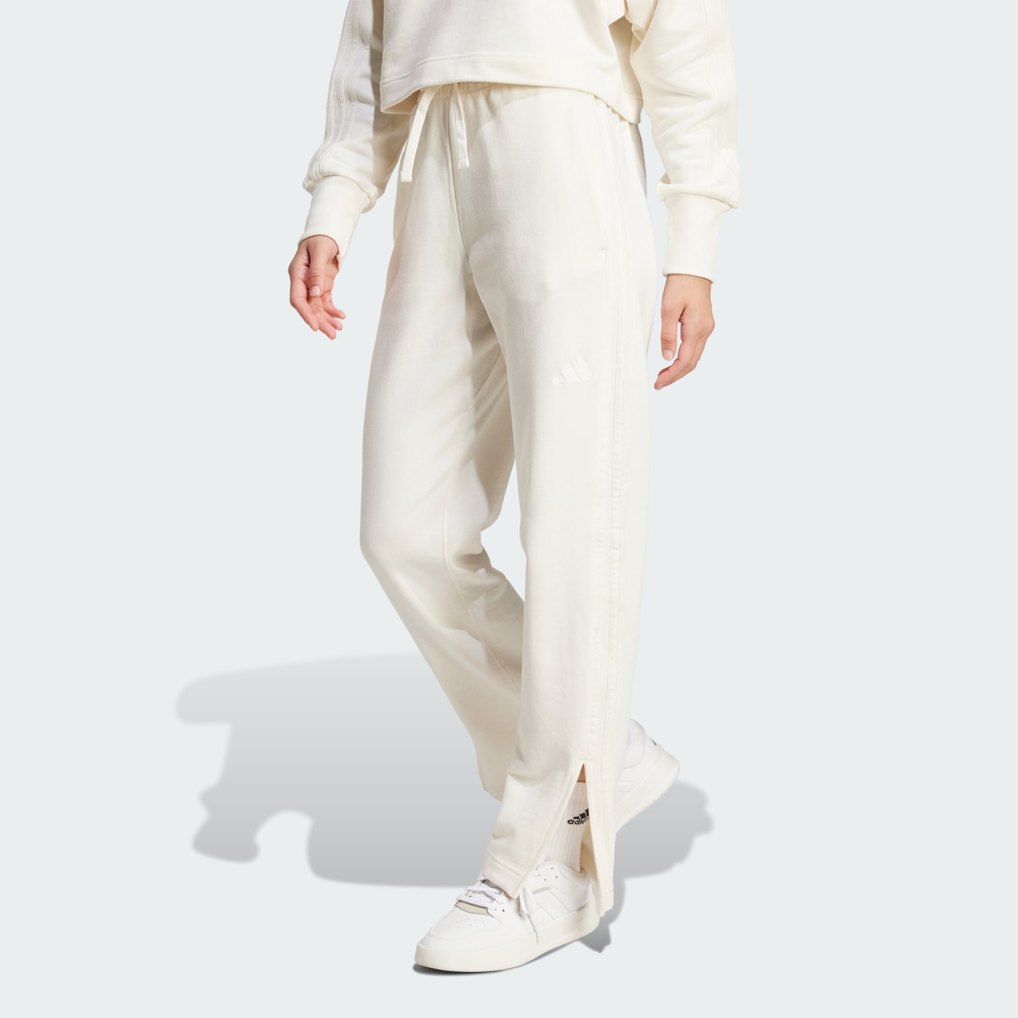 Njut av komforten i de här byxorna med ledig stil från adidas. Den lösa passformen ger rörelsefrihet, oavsett om du slappar hemma eller är ute på språng. Sidosprund ger en oväntad touch som ger siluetten en modern stil. En elastisk midja ger komfort hela dagen. Klassiska 3-Stripes längs sidosömmarna fulländar denna förfinade version av ett vardagsplagg. Bomullen i den här produkten har hämtats via Better Cotton. Better Cotton använder en modell som kallas massbalans. Det betyder att Better Cotton inte fysiskt kan spåras tillbaka till slutprodukten. Läs mer här: https://bettercotton.org/who-we-are/our-logo/