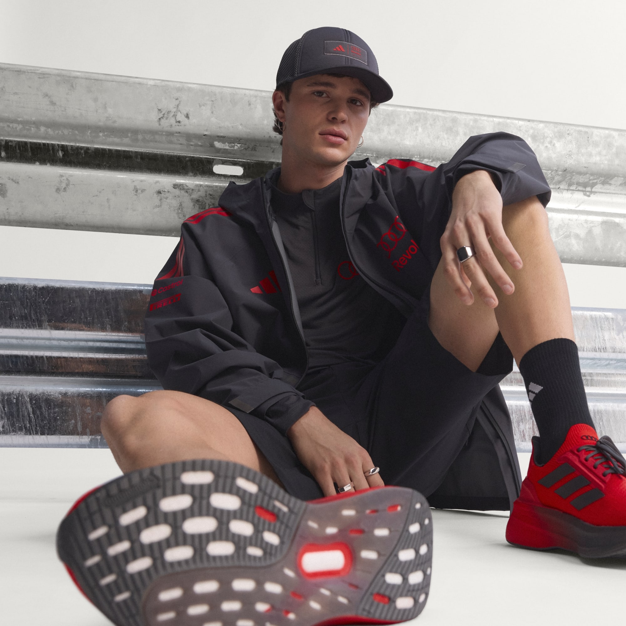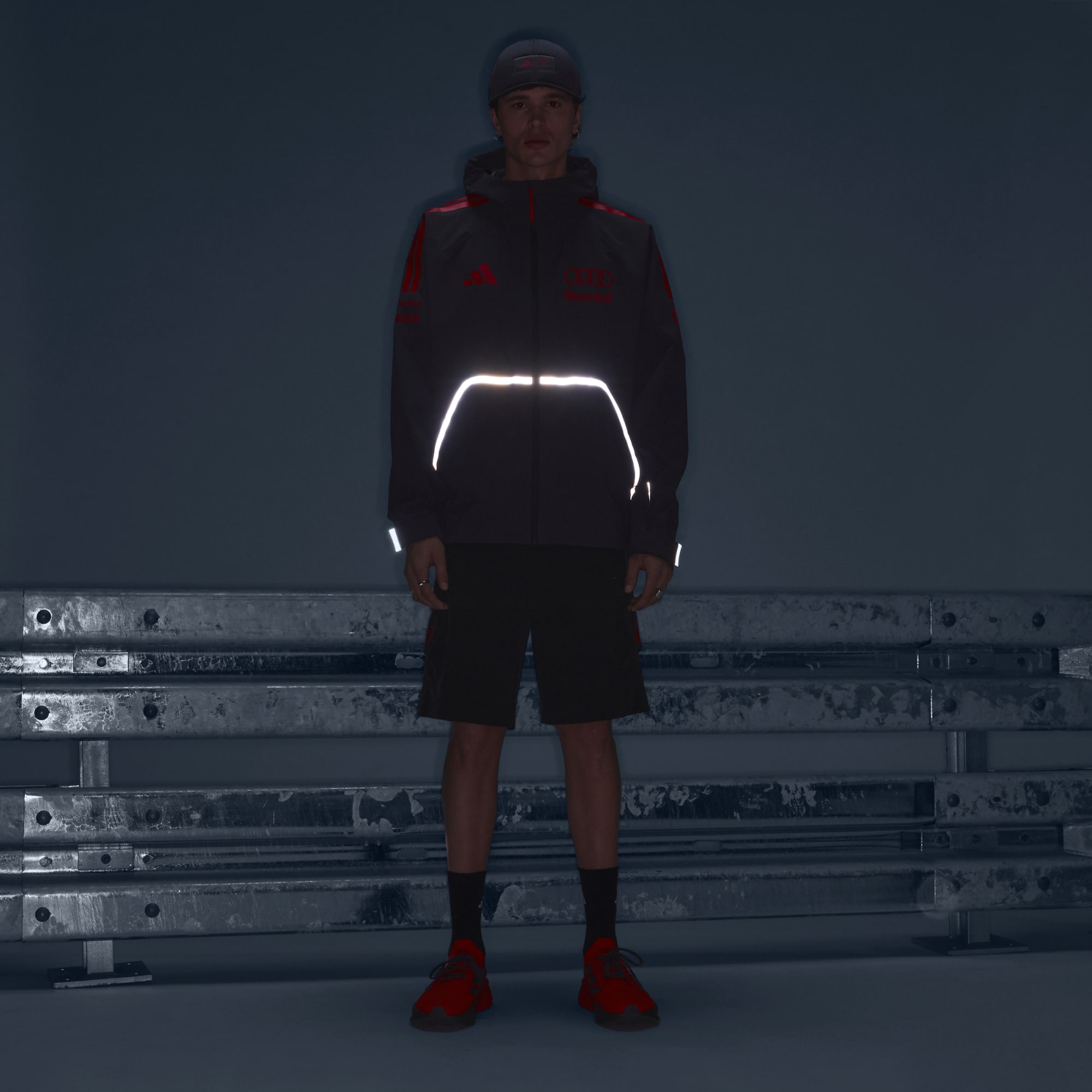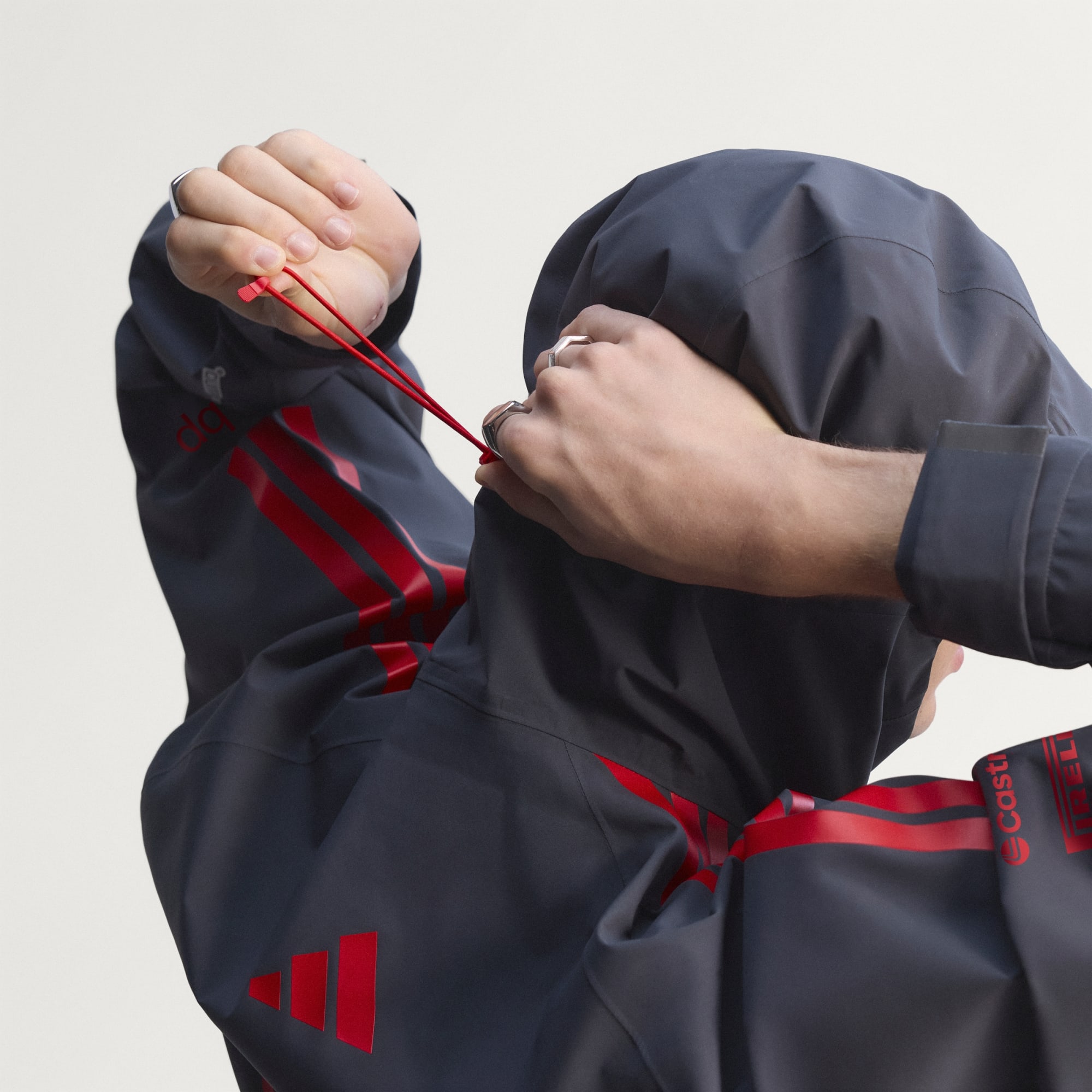 Regnjackan Audi Formula One Team Mechanics är designad för dig som lever och andas motorsport. Den här jackan ser inte bara till att du håller dig torr. Den visar också upp din kärlek för Audi-teamet. Regnjackan har ikonisk Audi-märkning med fyra ringar: en blinkning till den precision och prestanda som blivit varumärkets signum. Praktiska funktioner som fickor med dragkedja och justerbara muddar gör jackan lika praktisk som stilsäker. Integrerad Climaproof-teknik stänger ute väta och hjälper till att avleda svett för optimal komfort. Det vattentäta och ventilerande materialet skyddar mot väder och vind, medan huvan som kan justeras på två sätt ger ökat skydd. Den här jackan är designad för stil och prestanda och passar lika bra när du befinner dig på banan, som när du tar en promenad på stan. Hylla spänningen i motorsporten tillsammans med adidas och Audi.
