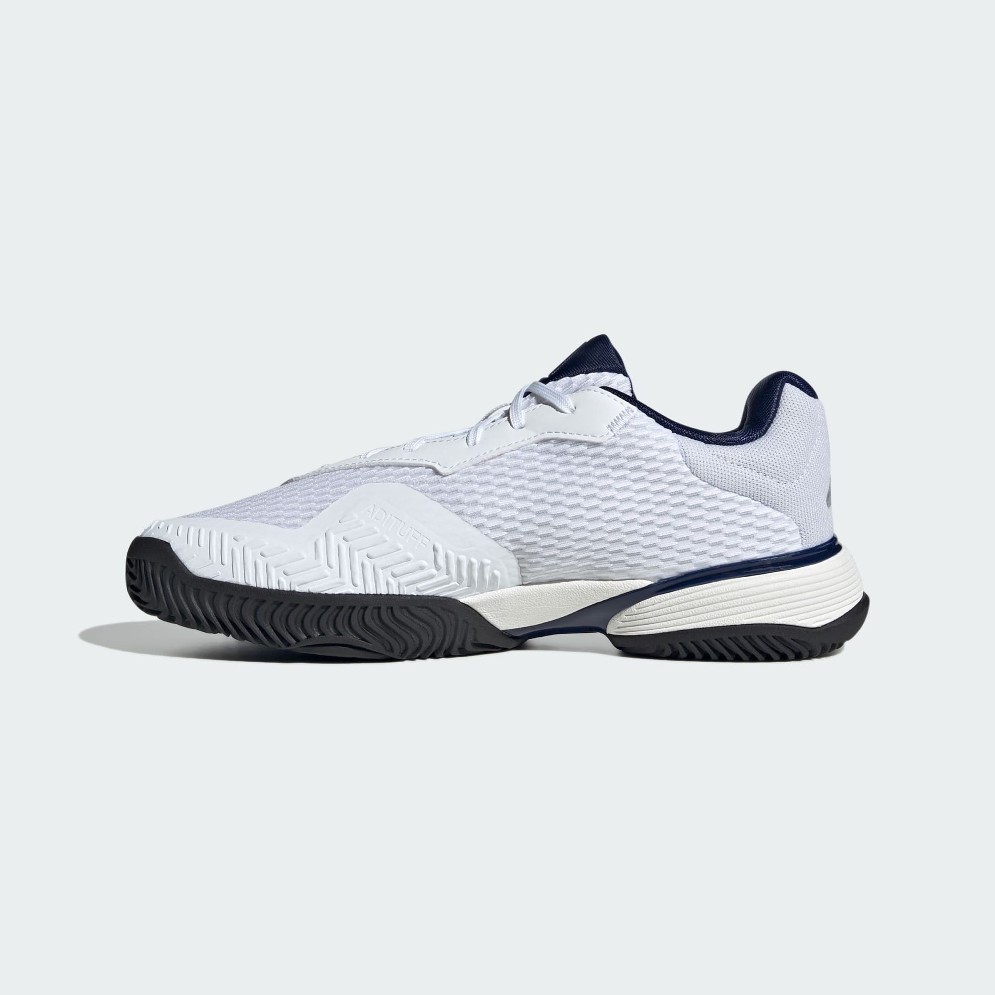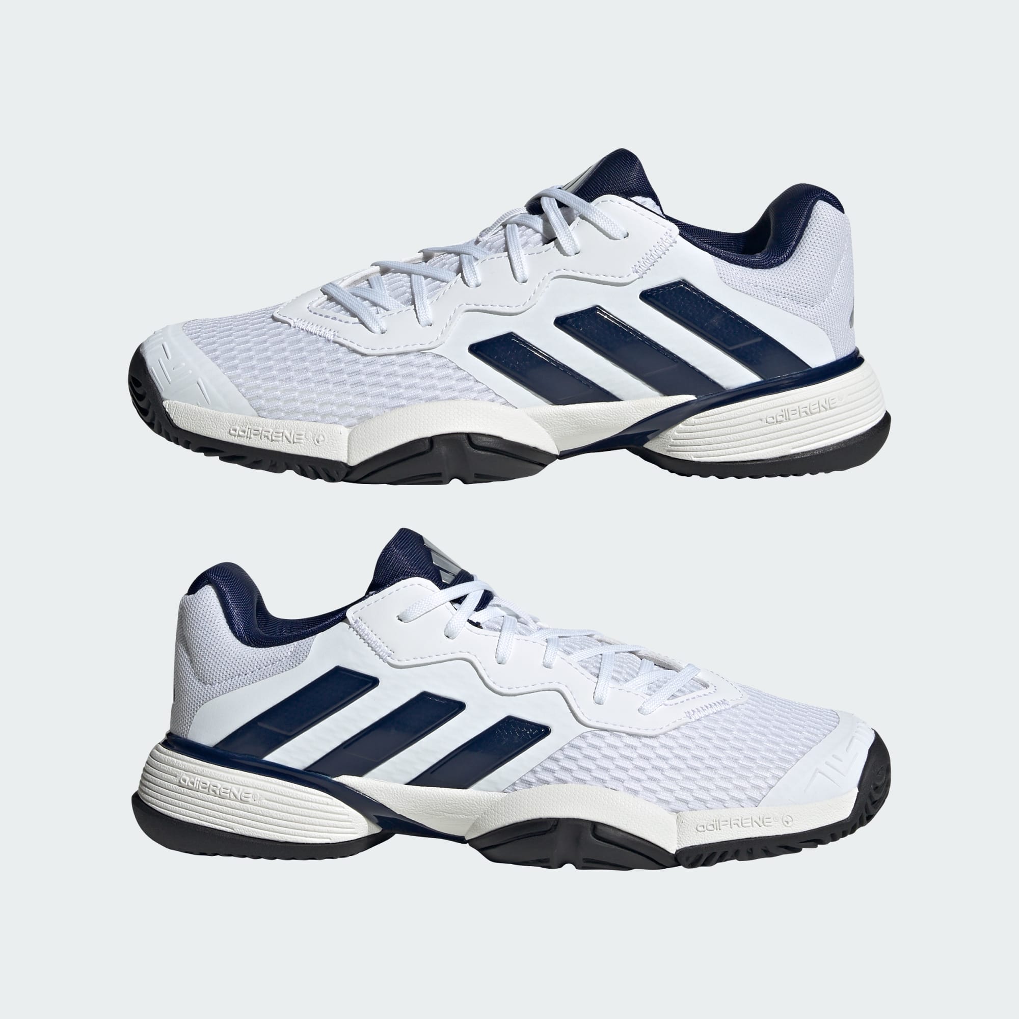 Fokusera på matchen. De här tennisskorna för ungdomar tar hand om resten. Den lätta ovandelen har ett mjukt foder som ger en bekväm känsla och stöd genom varje bollduell, och Adiprene+-dämpningen absorberar stötar för smidiga steg. Yttersulan av typen non-marking ger ett säkert grepp utan att slita på planen, så att inget distraherar dig under matchavgörande ögonblick. Den här produkten innehåller minst 20 % återvunnet material. Genom att återanvända material som redan skapats bidrar vi till att minska avfall, minska vårt beroende av ändliga resurser och minska våra produkters miljöavtryck.
