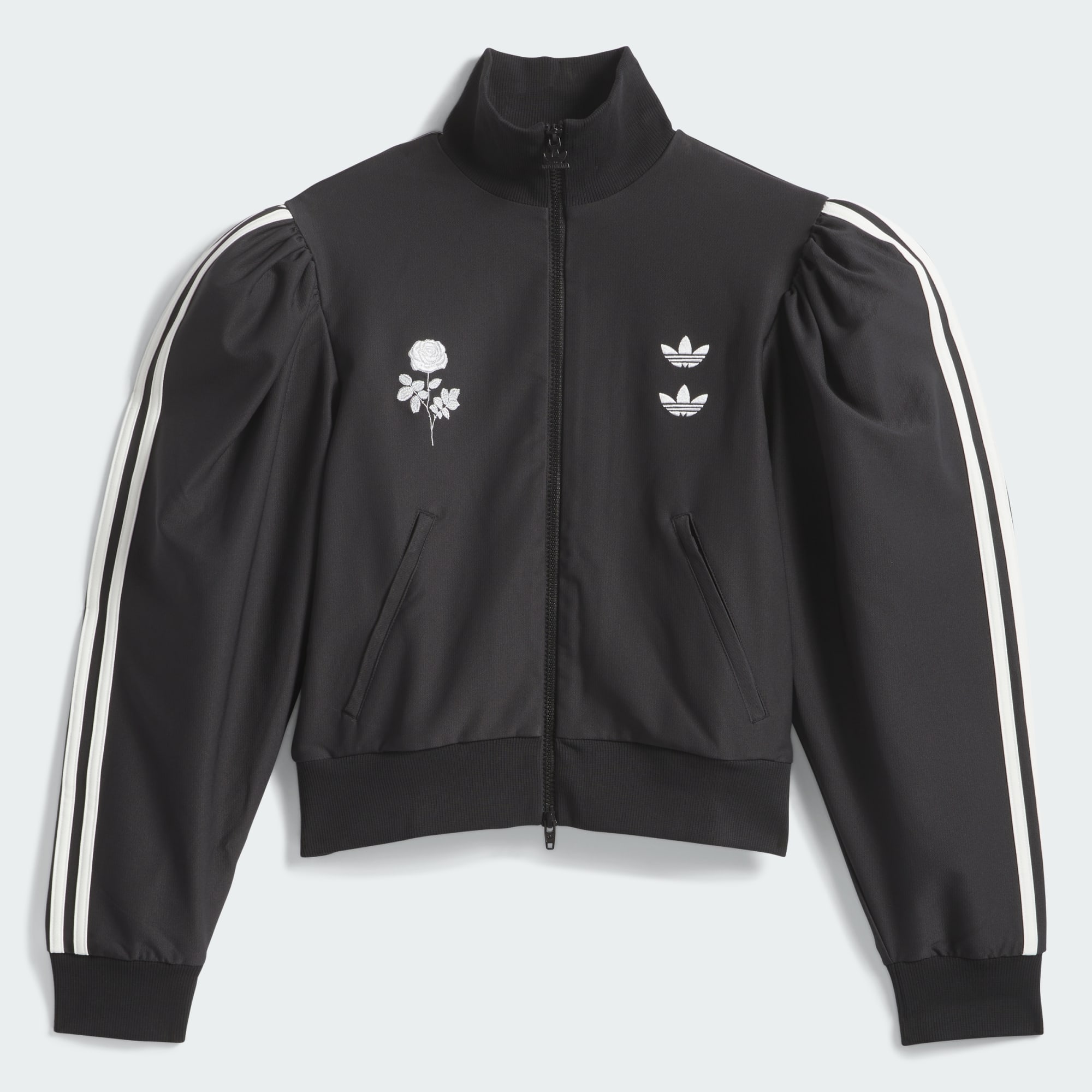 Chavarria Blouse-träningsjackan är tillverkad av återvunnen polyestertwill för att exceptionell kvalitet och slitstyrka. Träningsjackan har en åtsittande passform runt kroppen, och överdimensionerade, puffiga ärmar. Den har funktionella detaljer, som ribbad krage, muddar, fåll, samt två passpoalfickor fram. Träningsjackan har broderade dubbla Trefoil-loggor till vänster på bröstet, och en broderad ros till höger på bröstet. Den har också 3-Stripes längs axlar och ärmar.