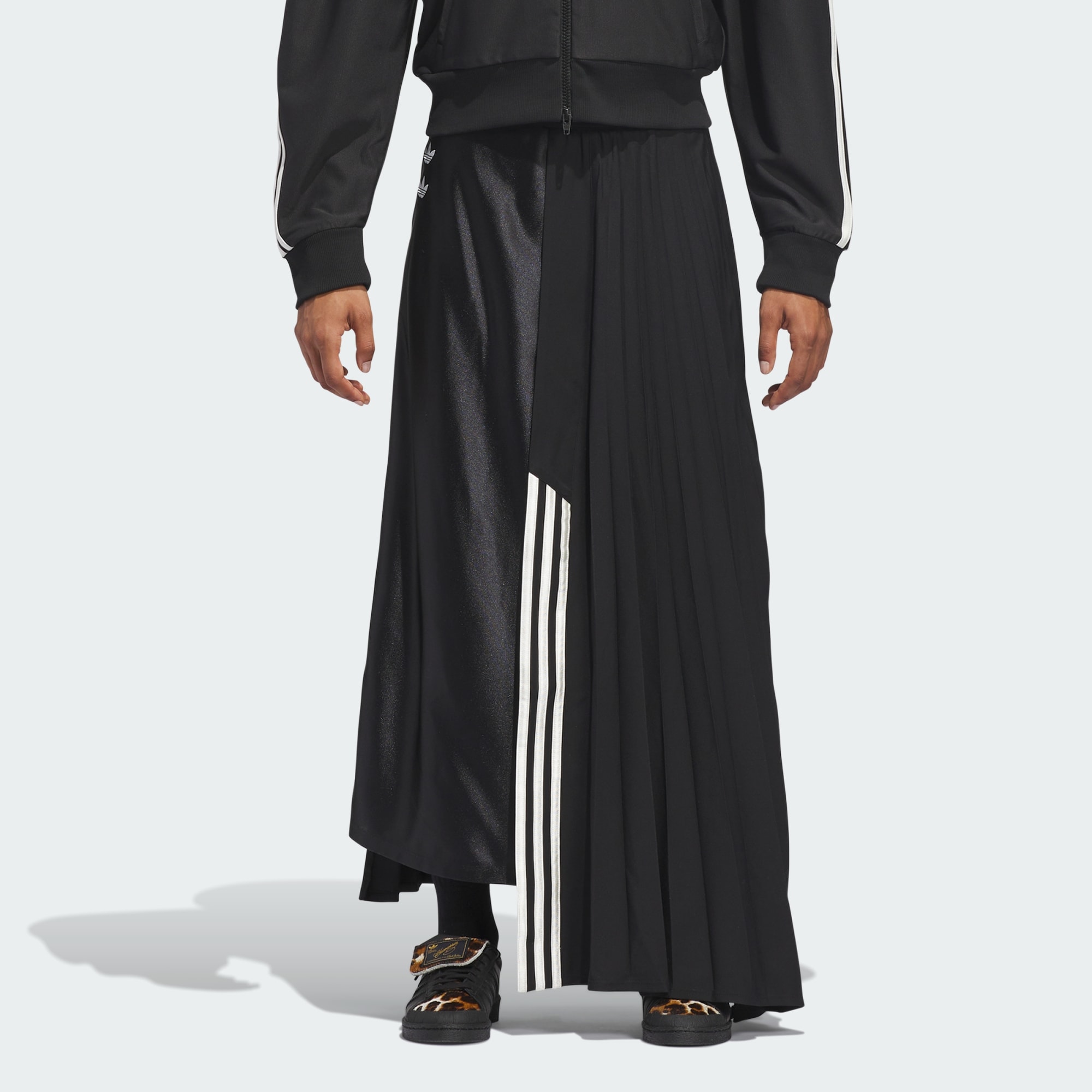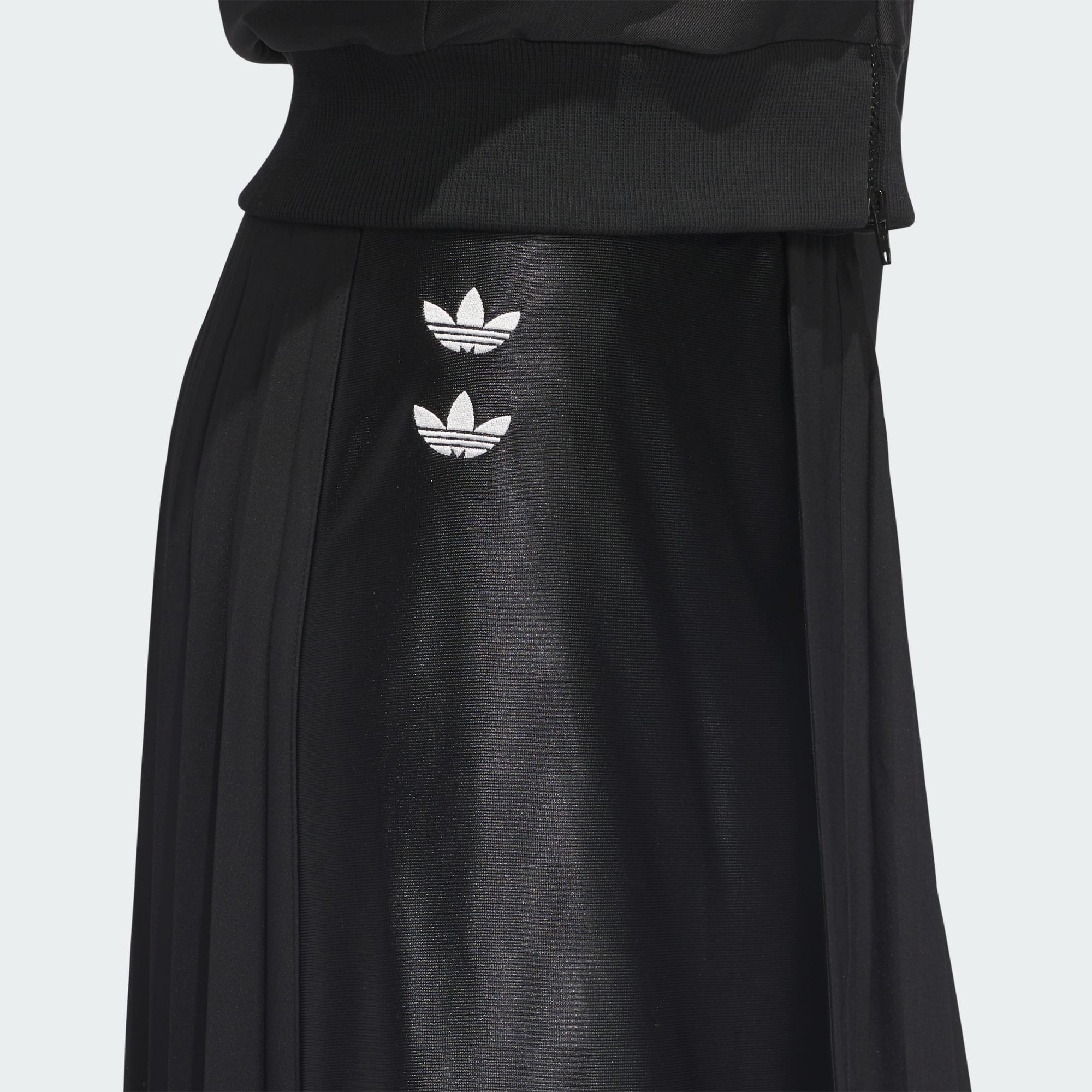 Chavarria plisserad kjol är tillverkad av ett lättviktigt, glansigt trikåtyg av hög kvalitet. Den plisserade kjolen har en normal passform, en elastisk midja och solfjäderveck för extra volym. Broderade dubbla Trefoil-loggor på höger lår och pålagda 3-Stripes framtill tillför en ikonisk adidas-touch.