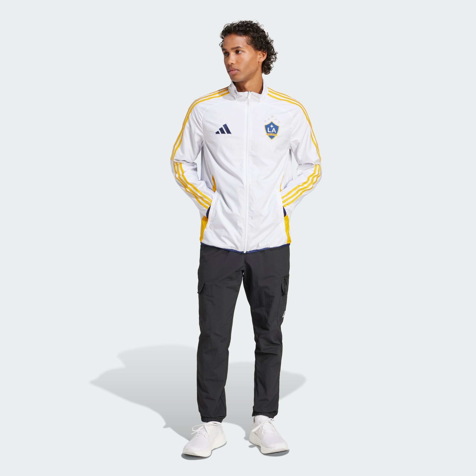 Show you stand with your club. Built to give you options, this LA Galaxy anthem jacket from adidas is the one the players zip up before they walk onto the field. Cut for a slim fit from smooth ripstop fabric, it has a club badge on each side so your football fandom is always on display. This product is made with 100% recycled materials. By reusing materials that have already been created, we help to reduce waste and our reliance on finite resources and reduce the footprint of the products we make.