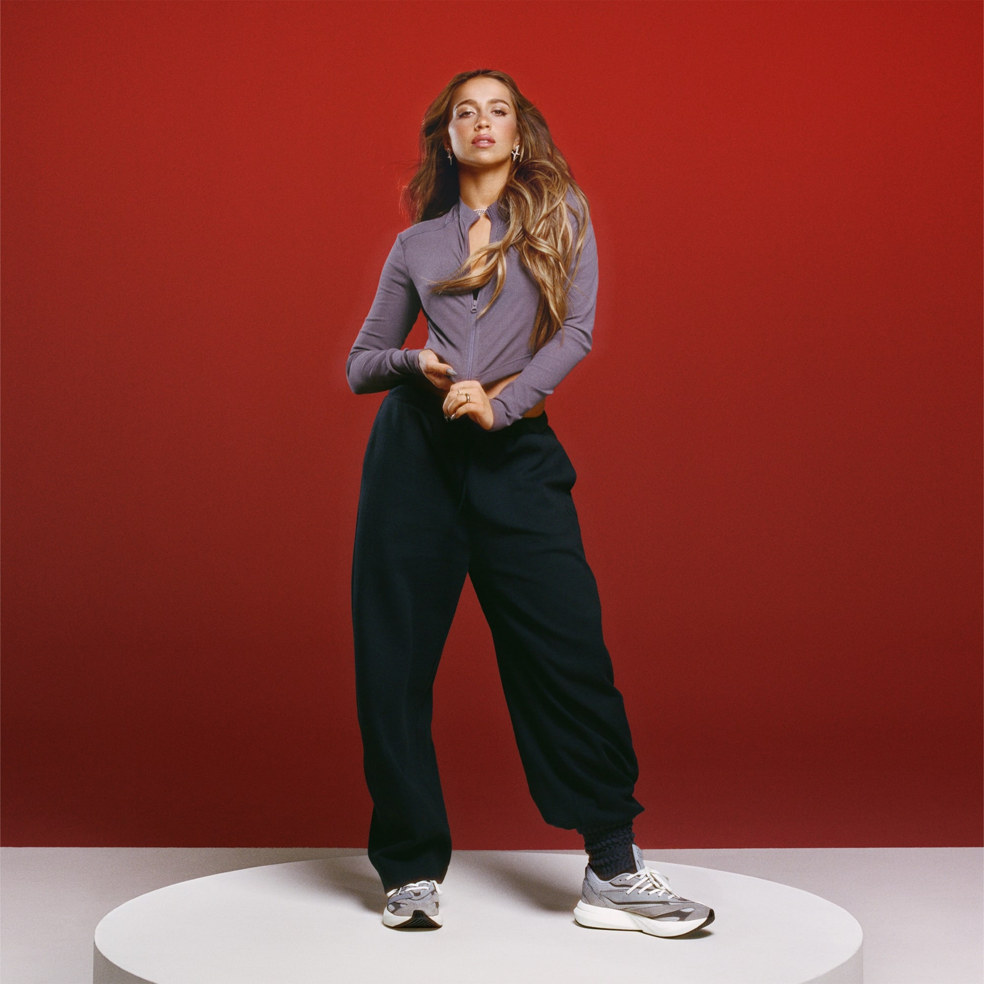 En närbild av en grå och vit sportsko med en texturerad sula, mot en pulserande röd bakgrund.