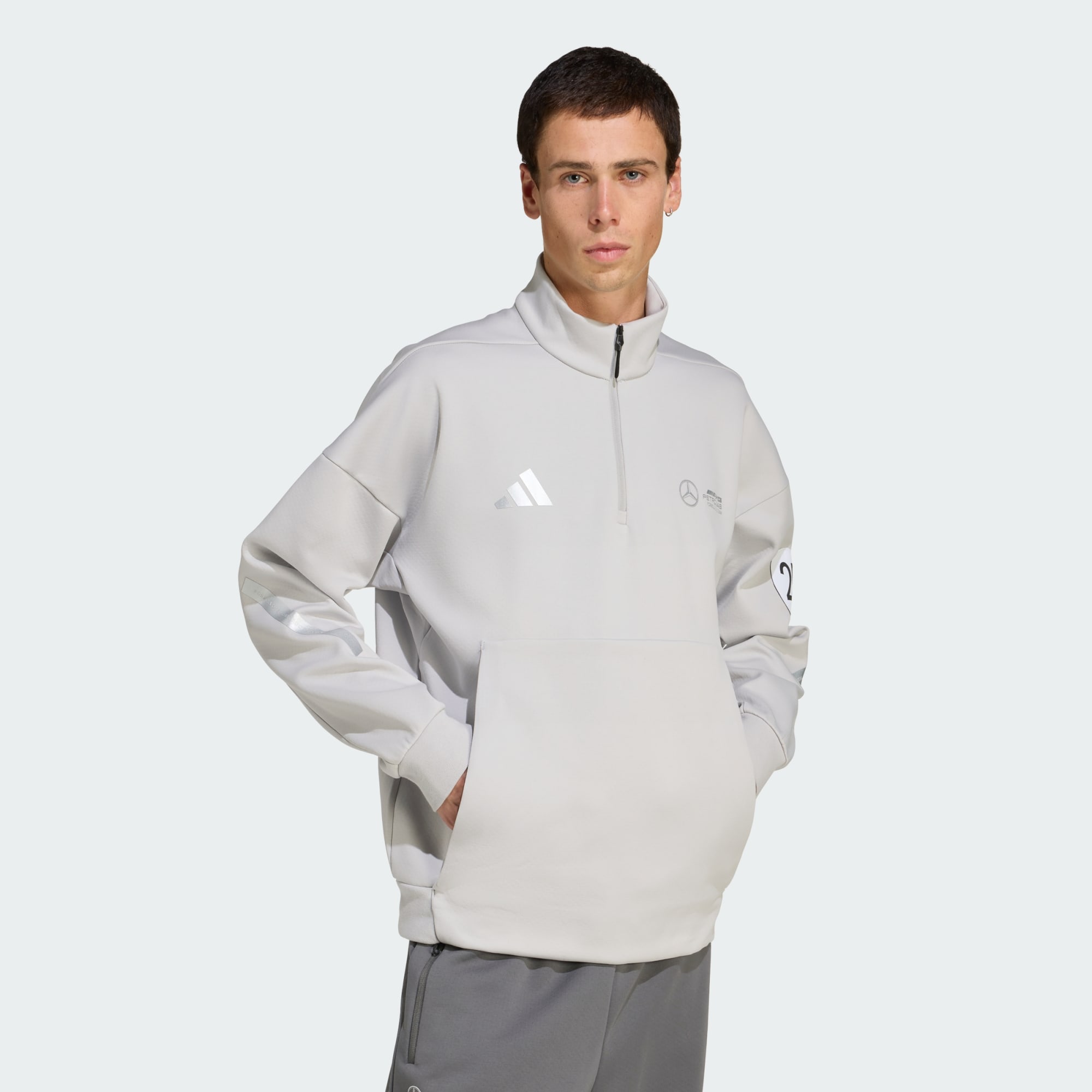 Representera ditt favoritracingteam i denna sweatshirt från adidas Motorsport. Den här tröjan med halv dragkedja är tillverkad av mjuk och slitstark bomull och polyester med adidas PRIMEKNIT för en anpassningsbar passform och handlar om komfort och värme. Mercedes – AMG Petronas Formula One Team-märkning fulländar den officiella looken.