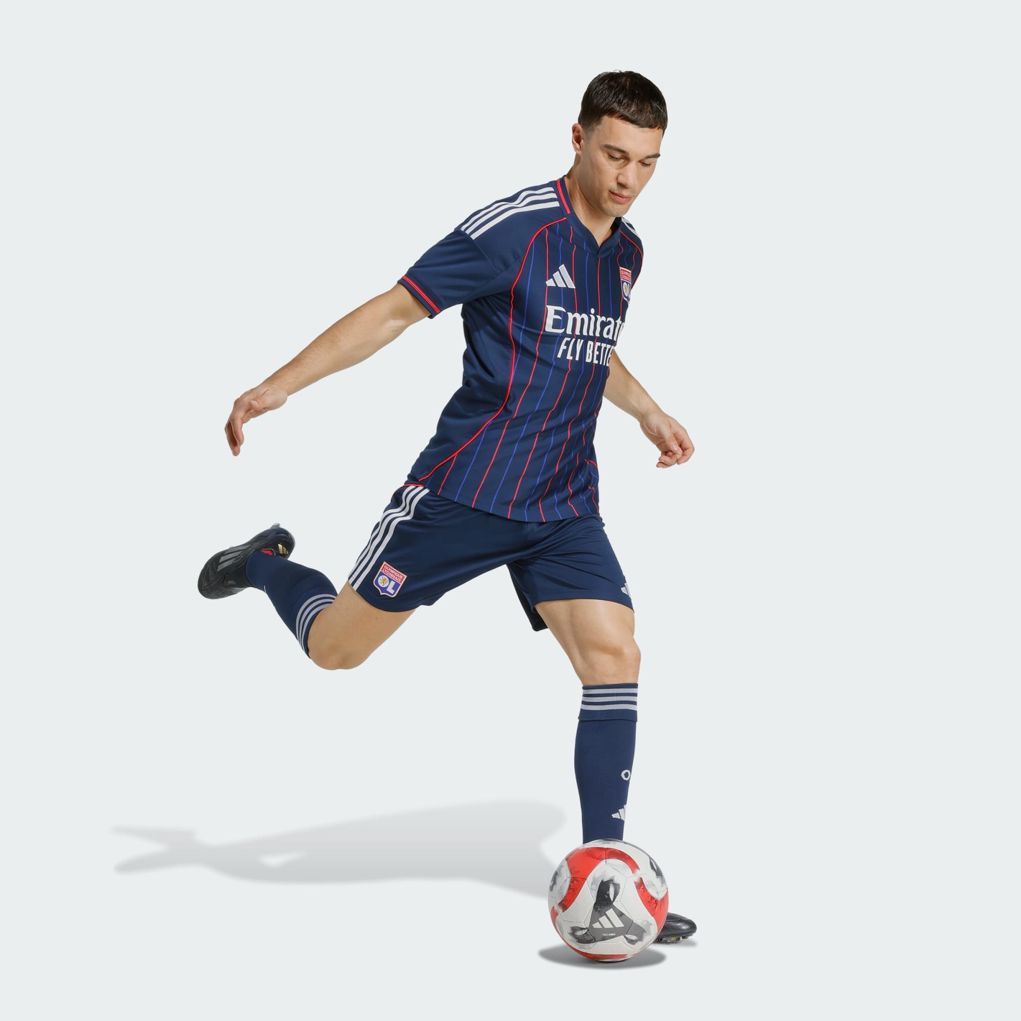 Var stolt över dina fotbollsfärger. Denna adidas Olympique Lyonnais-tröja lånar från några av klubbens mest populära bortaställ och har röda och blå kritstrecksränder över en marinblå bas. Bakom den iögonfallande designen kontrollerar AEROREADY fukt för att hålla fans och spelare bekväma. Ett vävt klubbemblem och "Fiers de nos couleurs"-signaturen ger L'OL-stolthet till den tidlösa looken.