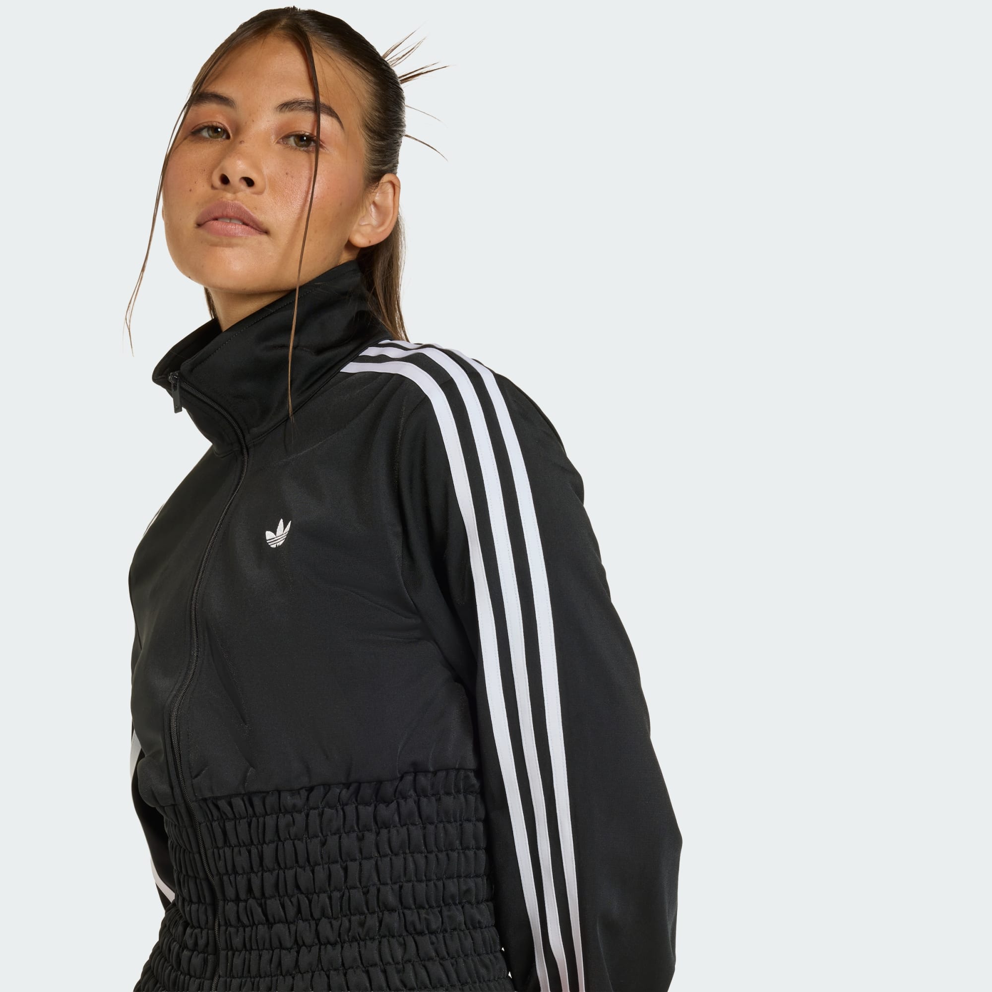 Den rynkade Firebird-träningströjan återuppfinner en adidas-ikon med uttrycksfulla detaljer. Den klassiska träningsformen är inspirerad av fotbollskulturen och har förhöjts med smock, pärlor och paljetter för en unik look. Trikåmaterialet ger en slät och slitstark bas, medan den höga halsen och dragkedjan ger justerbar täckning. De är sköna att bära och följer dig naturligt mellan vardagsliv och sociala tillfällen. Med utsmyckningar som speglar din personlighet förenar designen adidas Originals med modigt självuttryck – en självsäker tolkning av sportinfluerat mode.