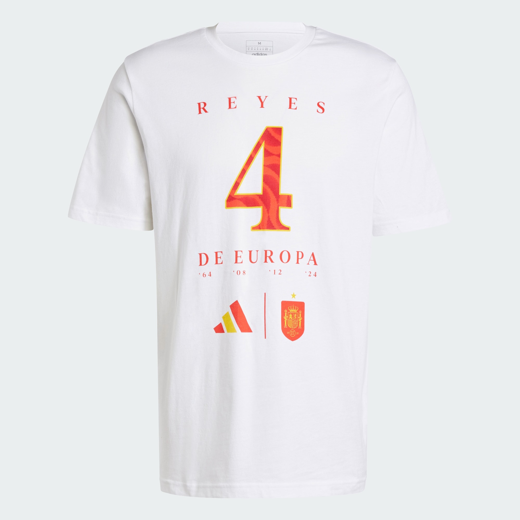 Spanien är återigen Europas kungar! Hylla landslagets minnesvärda triumf i Berlin med den här mjuka t-shirten i ren bomull från adidas. Grafiken som hyllar lagets fjärde seger gör den här t-shirten till ett oförglömligt minne för Spanien-fans och andra fotbollsälskare.