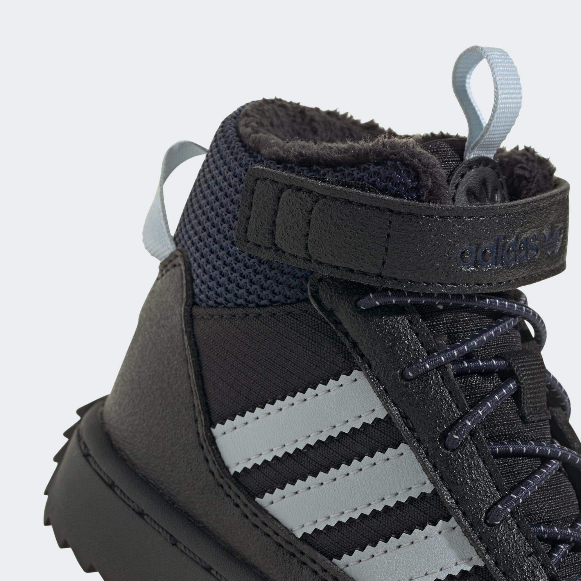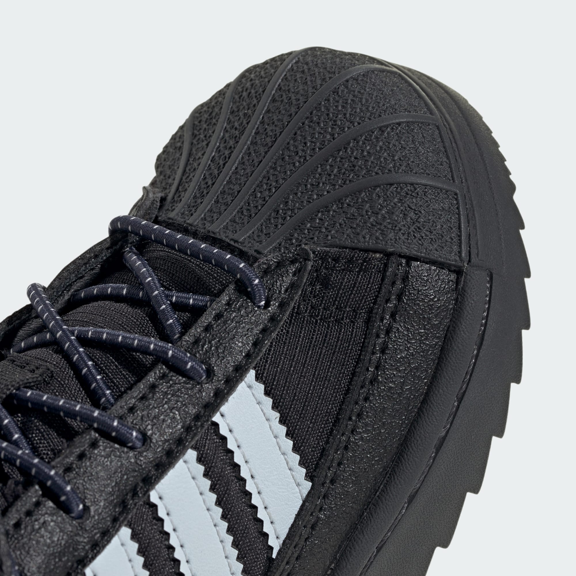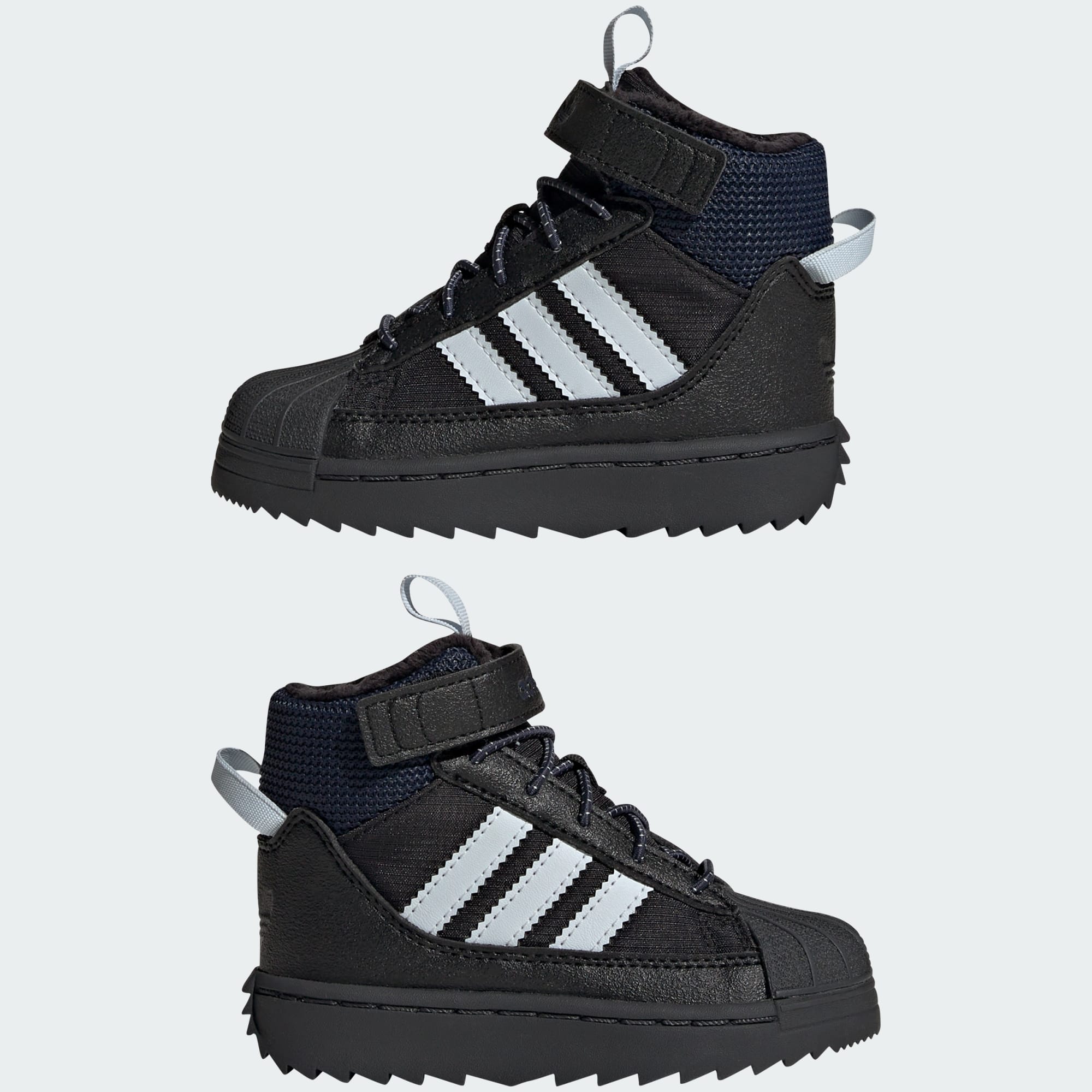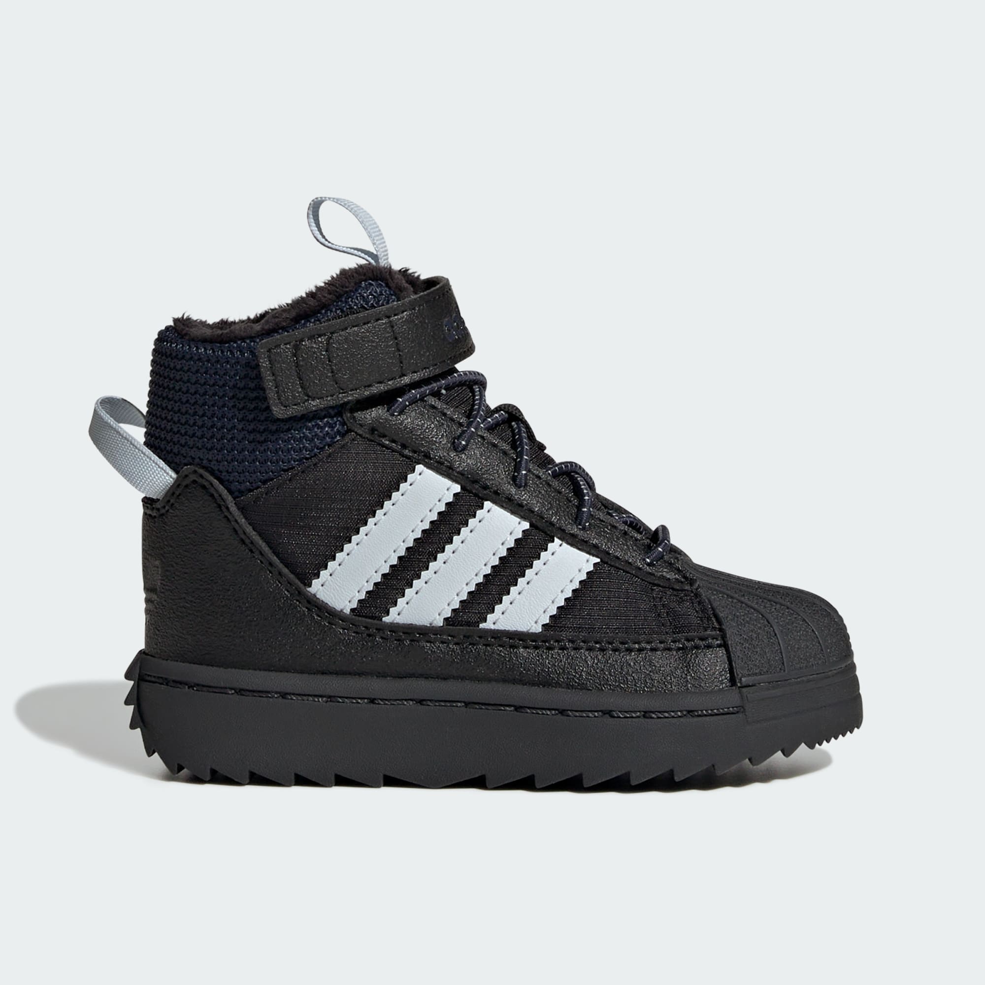För små äventyrare som är redo att utforska vintern ger de här adidas Superstar Winter Trek-skorna för baby ikonisk stil och väderskydd. En invändig känga stänger ute regn och snö, och den rejäla yttersulan ger bra grepp i hal terräng. Elastiska snören och kardborreband gör skorna enkla att ta på och av. Med en ovandel i nylon med mockaöverdrag ger skorna en mångsidig stil som är redo för vintern.