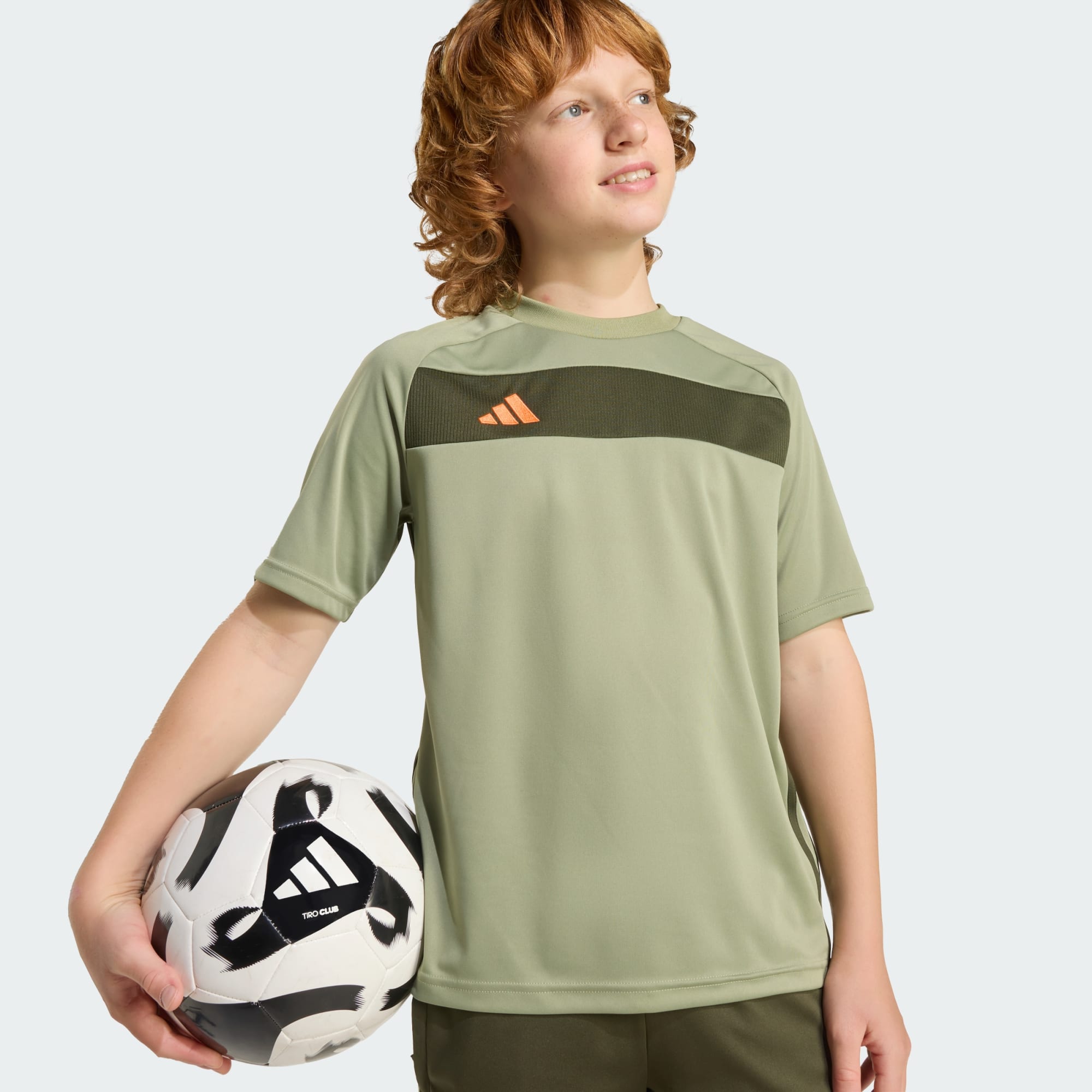 En Tiro-fotbollströja med rund halsringning, gjord med återvunnet material.