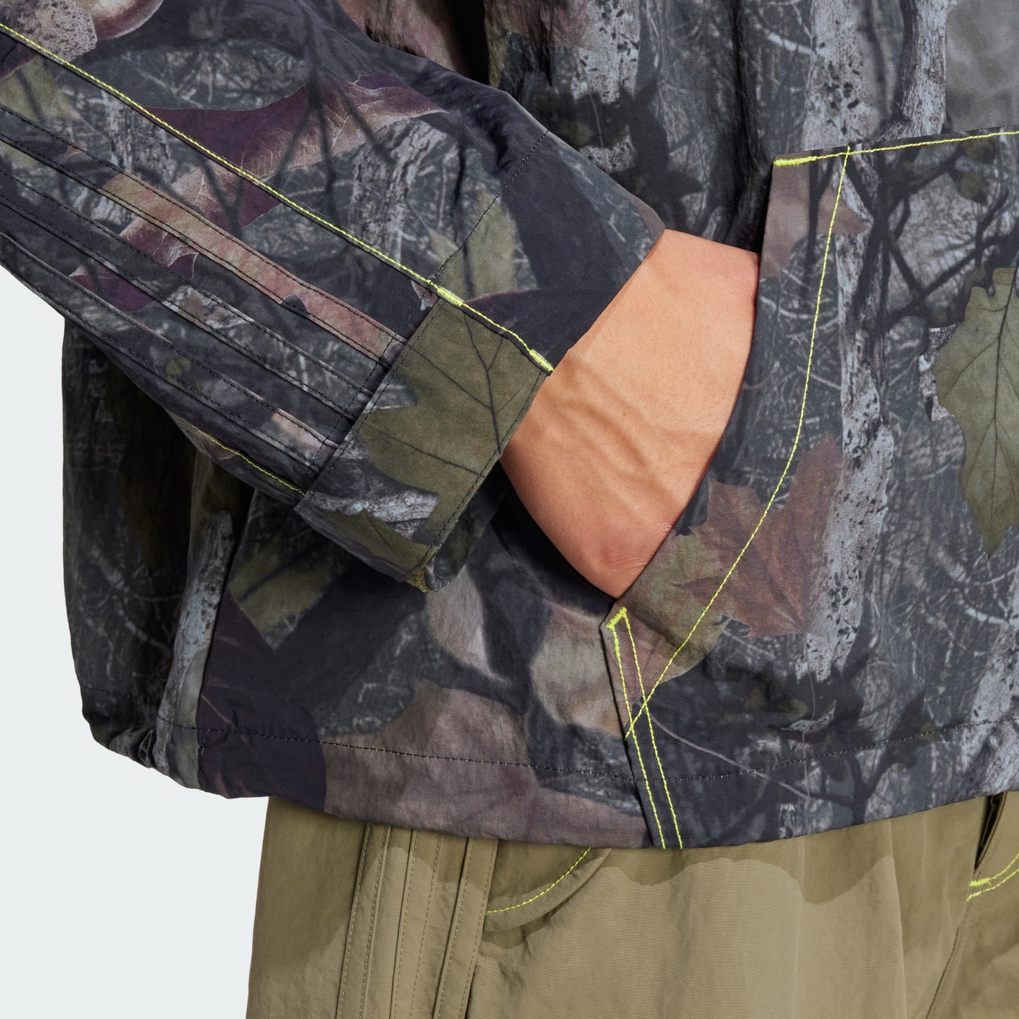 Den här adidas-jackan har en avslappnad stil. Den är tillverkad i ett kamouflagemönstrat material och har en lös passform som gör det enkelt att lägga den över huvtröjor och tröjor. En hög skorstenskrage och huva ger dig extra täckning.